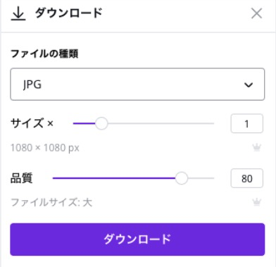 Canva ProではJPG画像をダウンロードする際に、サイズと品質を設定してデータ量を制御することができます。無料版の場合はPNGでダウロードしてから、別のソフトで画像サイズや圧縮率を変更することになります。