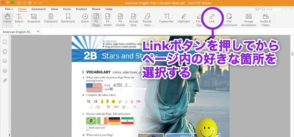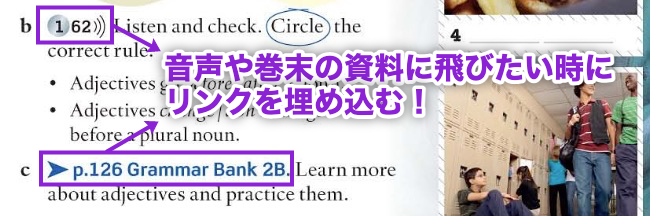 音声や動画をPDFに「埋め込む」のではなく、あくまでも「リンク」です。PDFに埋め込まれるのは、外部のファイルを呼び出すためのリンク情報だけです。ファイル内の巻末のページへのリンクなんかも同様の手順で埋め込めます。教科書内を行ったり来たりする手間も省けます。