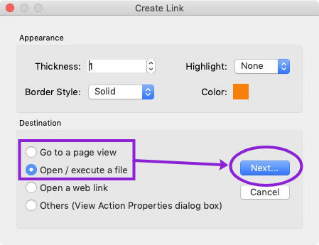 下半分の「行き先」設定が重要で、PDF内の別ページに飛ぶなら “Go to a page view”、音声や動画を再生したければ “Open / execute a file” を選び、Next… ボタンで次に進みます。