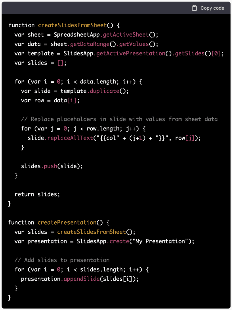 Google Apps Scriptのコードを書いて code snippet で読みやすく表示してください。Google Formsの回答結果が出力されたGoogleスプレッドシートからデータを読み取り、各行を1ページのGoogleスライドに変換します。スライドのレイアウトは予め用意されたテンプレートから取得してください。