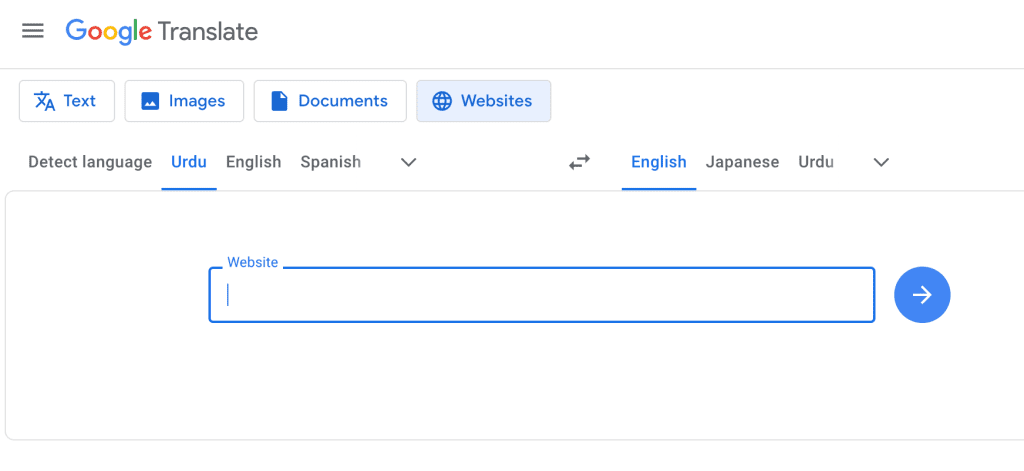 上記の方法はGoogle翻訳の画面を開いてURLを入力する、という手間を省くためのショートカットを使っていることがポイントです。ショートカットを使わない場合の手順がこちらです。この画面を開くと、ウルドゥ語から英語に変換する画面になります。マウスクリックで言語を選ぶことができます。