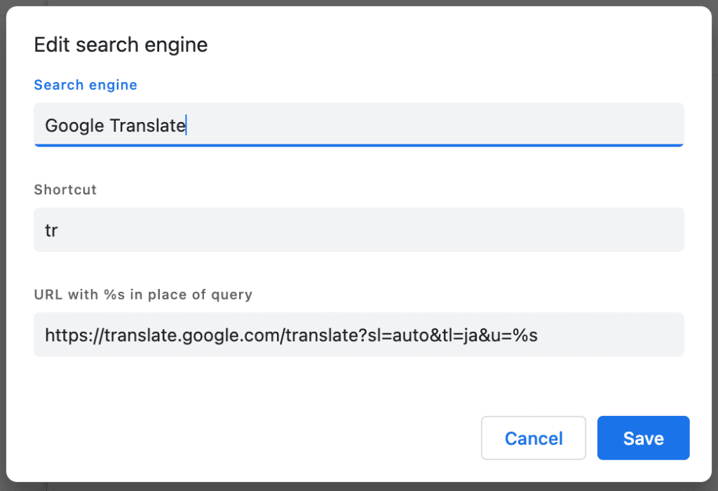 ここで設定した文字列を使って、後でGoogle翻訳(または任意のウェブ検索)を素早く呼び出すことができます。自分が覚えられて、かつ短い英数字の組み合わせを書きましょう。上の例では「tr」の2文字が書かれていますが、別に「abc」でも何でも構いません。