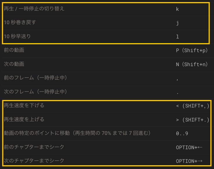 もっとも利用頻度の高いキーボードショートカットです。できればぜんぶ覚えてほしいのですが、とりあえず筆者が四角く囲んだ部分はとても重要なので、ぜひ使えるようになってください。これだけでYouTubeの使い勝手が格段に向上します。